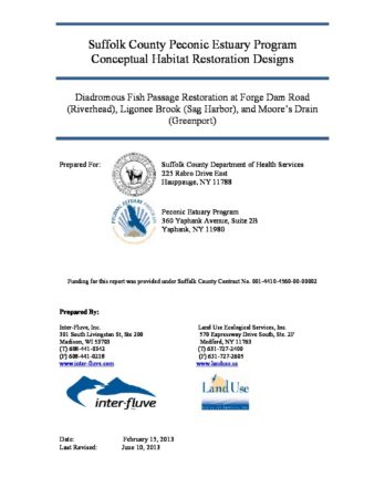 This Report includes feasibility assessments and conceptual designs for fish passage restoration projects at Forge Road Dam, Ligonee Brook, and Moore’s Drain. The results of this conceptual feasibility and design study can be used to prioritize improvement efforts for fish passage on eastern Long Island. Feasibility level costs and other considerations, such as design constraints and regulatory permitting requirements, are included to inform the final design of construction plans and specifications for recommended structural remedies.