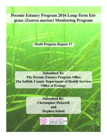 This report presents the data and observations collected during The Peconic Estuary Program Long Term Eelgrass Monitoring Program in 2016. The program monitors eight reference eelgrass beds in the Peconic Estuary and they include: Bullhead Bay (Southampton), Gardiners Bay (Shelter Island), Northwest Harbor (East Hampton), Orient Harbor (Southold), Southold Bay (Southold), Three Mile Harbor (East Hampton), Cedar Point (East Hampton), Orient Point (Southold).