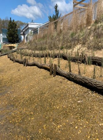 Historically, natural wood terracing has been used to stabilize steep slopes. Terraces are created using short walls of wood to help absorb wave energy and hold a platform of sediment in place behind them. Unlike a conventional bulkhead, these shorter walls do not reflect wave energy, block landward migration of marshes, or cause the other issues associated with hardened shorelines. Instead, water is able to wash over each terrace and wave energy is absorbed while steep slopes are stabilized and protected from erosion. For this demonstration plot, a single-tier wooden terrace has been constructed from natural, native, and rot-resistant wood logs.