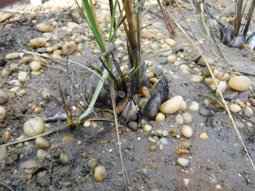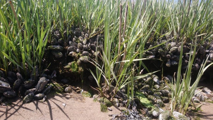 Ribbed mussels clustered around Spartina shoots at the demonstration project site.