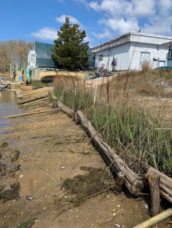 This demonstration project also incorporates other natural structures to further stabilize the shoreline and provide a surface to which plant roots and mussels can attach. For example, bagged shell, rocks, coir logs, and wooden terracing are all included in the living shoreline project in order to test and demonstrate benefits, effectiveness, and appearances of each material in combination with the living features of the shoreline, Spartina grass and ribbed mussels.