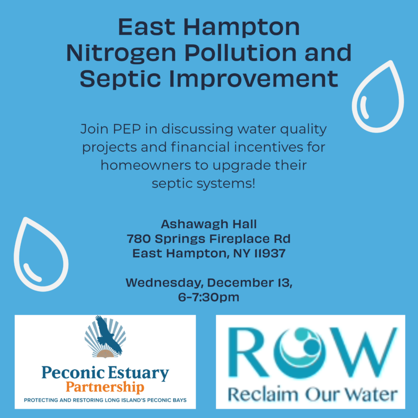Please join PEP for a meeting at Ashawagh Hall. We will be presenting on the issue of nitrogen pollution and its effects, water quality projects in the area, and financial incentives for homeowners to upgrade their septic systems.