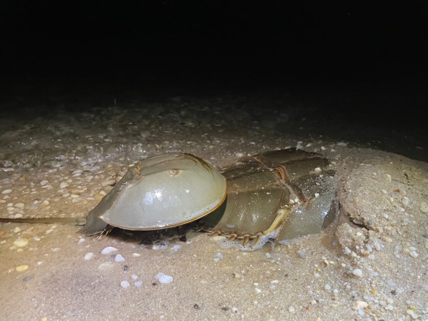 The extra height of the spring tide provides horseshoe crabs with an opportunity. If they lay their eggs at the edge of the shoreline during these extra high tides, they can reduce the number of predators that have access to them. However, as marine creatures, they will die if they get stuck on land and congregating at the edge of the water line is flirting with fate. They could get flipped over by a wave and dry out. Or they could be scooped up and thrown in the back of a pickup truck by fishermen. Some of the horseshoe crabs taken are used as bait for whelk and eels. Others are sold to biomedical companies’ in pursuit of their blood, which contains Limulus amebocyte lysate, (LAL). LAL reacts when exposed to gram negative bacteria, making it useful for testing drugs and devices before they come in contact with human blood. Some horseshoe crabs come to the beach to spawn, but are instead met with a seawall, or groin, making it impossible to dig their nests and lay their eggs, or fragmenting the shoreline so males have a harder time finding females.