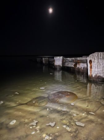 Like any good parent, horseshoe crabs want their offspring to have the best chances of survival, so they make the trip to the shore despite the risks. I try to meet them there. On the night of the Strawberry moon, the full moon of June, these dangers seem distant. The night is completely calm and almost cloudless, and the brightness of the moon affords better visibility than I’m accustomed to. Tiny human footprints are visible underwater; without any waves to clear the canvas, the evidence of a toddler pushing a toy truck around earlier that day is still intact. Eels emerge in the shallow water, wiggling up almost right onto the beach. Little sand fleas dominate the space between the lapping waves. Silversides smack the surface with their tails and catch the light from my flashlight. If I came with no expectations, it’d be a perfect night. The problem is, I’m here for horseshoe crabs—and I’ve been stood up.