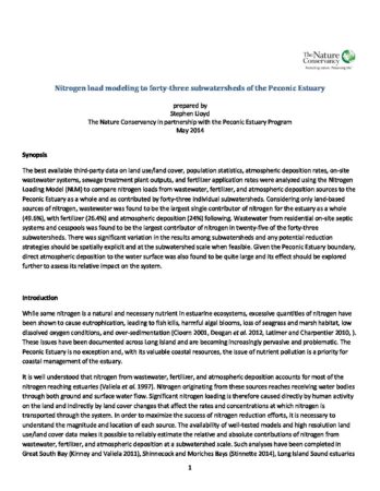 The Nature Conservancy produced this report detailing the results of a Nitrogen Load Model (NLM) applied for forty-three subwatersheds in the Peconic Estuary Watershed. The best available third-party data on land use/land cover, population statistics, atmospheric deposition rates, on-site wastewater systems, sewage treatment plant outputs, and fertilizer application rates were analyzed using the NLM to compare nitrogen loads from wastewater, fertilizer, and atmospheric deposition sources to the Peconic Estuary as a whole and as contributed by forty-three individual subwatersheds. Considering only land-based sources of nitrogen, wastewater was found to be the largest single contributor of nitrogen for the estuary as a whole (49.6%), with fertilizer (26.4%) and atmospheric deposition (24%) following. Wastewater from residential on-site septic systems and cesspools was found to be the largest contributor of nitrogen in twenty-five of the forty-three subwatersheds. There was significant variation in the results among subwatersheds and any potential reduction strategies should be spatially explicit and at the subwatershed scale when feasible. Given the Peconic Estuary boundary, direct atmospheric deposition to the water surface was also found to be quite large and its effect should be explored further to assess its relative impact on the system.