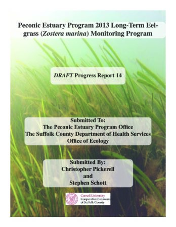 This report presents the data and observations collected during The Peconic Estuary Programês Long Term Eelgrass Monitoring Program in 2013. The program monitors eight reference eelgrass beds in the Peconic Estuary and they include: Bullhead Bay (Southampton), Gardiners Bay (Shelter Island), Northwest Harbor (East Hampton), Orient Harbor (Southold), Southold Bay (Southold), Three Mile Harbor (East Hampton), Cedar Point (East Hampton), Orient Point (Southold).