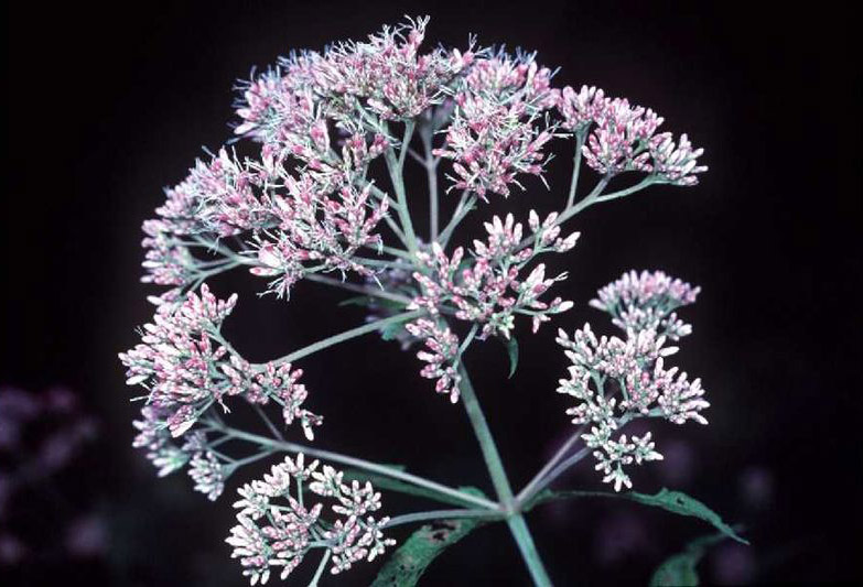 Joe-Pye Weed is a tall, sturdy perennial with dark green leaves. Clusters of tiny, fragrant, pinkish-rose-colored flowers bloom July-September. The nectar is highly valued by butterflies and honeybees. The flowers are followed by seed heads (which persist into winter), providing an important food source for sparrows, as well as providing seasonal interest. Joe-Pye Weed is a host plant for butterfly and moth larvae (caterpillars), including Three-lined Flower Moth (Schinia trifascia), Eupatorium Borer Moth (Papaipema eupatorii), and Clymene Moth (Haploa clymene). It prefers moist, fertile soils, and is intolerant of dry conditions. Use Joe-Pye Weed in masses in the back of borders to offer depth to your garden. It is best planted in groups in meadows, native plant gardens, butterfly gardens, rain gardens, or naturalized areas. It is valued by native Americans for its medicinal properties.