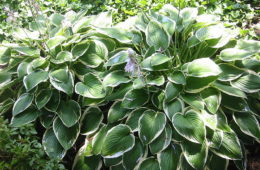 Hosta is a flowering perennial mainly grown for its attractive foliage. The Hosta genus includes many species and varieties with different combinations of leaf shapes, colors, and patterns. Bell-shaped flowers in a variety of colors bloom in late spring to summer on top of stalks extending above the foliage. This plant prefers moist, well-drained, organically rich soil. Use Hosta in shady beds and borders or in woodland gardens. Protect Hosta from deer browse, as it can be one of their favorite plants!